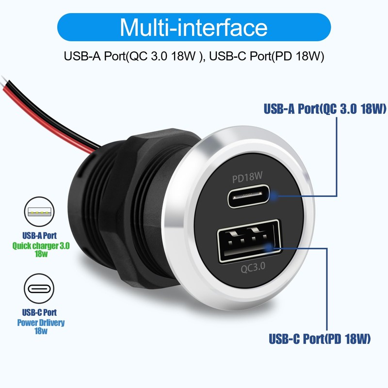 • 【2 in 1 Charger Socket】: This RV USB outlet is designed with dual USB type-A QC 3.0 port and USB type-C PD 3.0 port, each port supports 5V/9V/12V output charging voltage and provides maximum 24W high-speed charging. It supports charging two devices at same time.