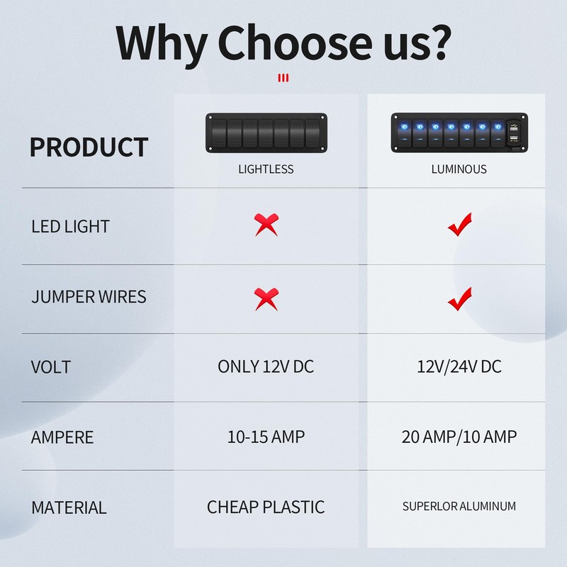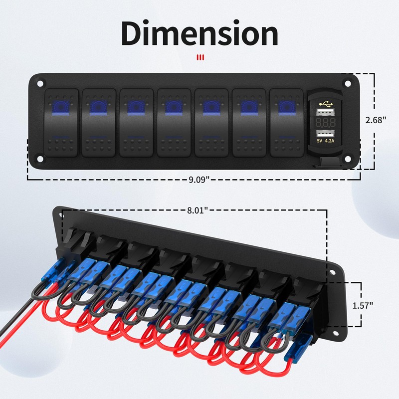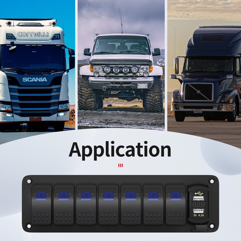 - Rocker Switch Panel: This DC 12V 20A/24V 10A 7 gang rocker switch panel control system can better control multiple circuits. IP66 waterproof switch panel is made of ABS and PC switches and conductive pins, which is corrosion resistant, strong flame retardant and durable