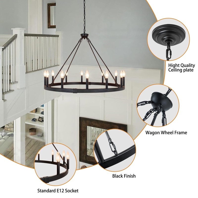 - ใ๐๐.๐ ๐๐ง๐๐ก ๐๐๐ ๐จ๐ง ๐๐ก๐๐๐ฅ ๐๐ก๐๐ง๐๐๐ฅ๐ข๐๐ซใlarge black wagon wheel chandelier features a high-quality and durable round frame with a classic black finish for allure. Anti-oxidant, non-fading and easy to clean. 12-Light design provides 360ยฐlight coverage thatโs soft, warm, and not overpowering, making the space where it is located obtain perfect lighting, which is a perfect complement to the high ceiling area and the lobby area. Larger and brighter than standard wheel chandeliers. Beyond brightening your abode, it will gets many amazing compliments.