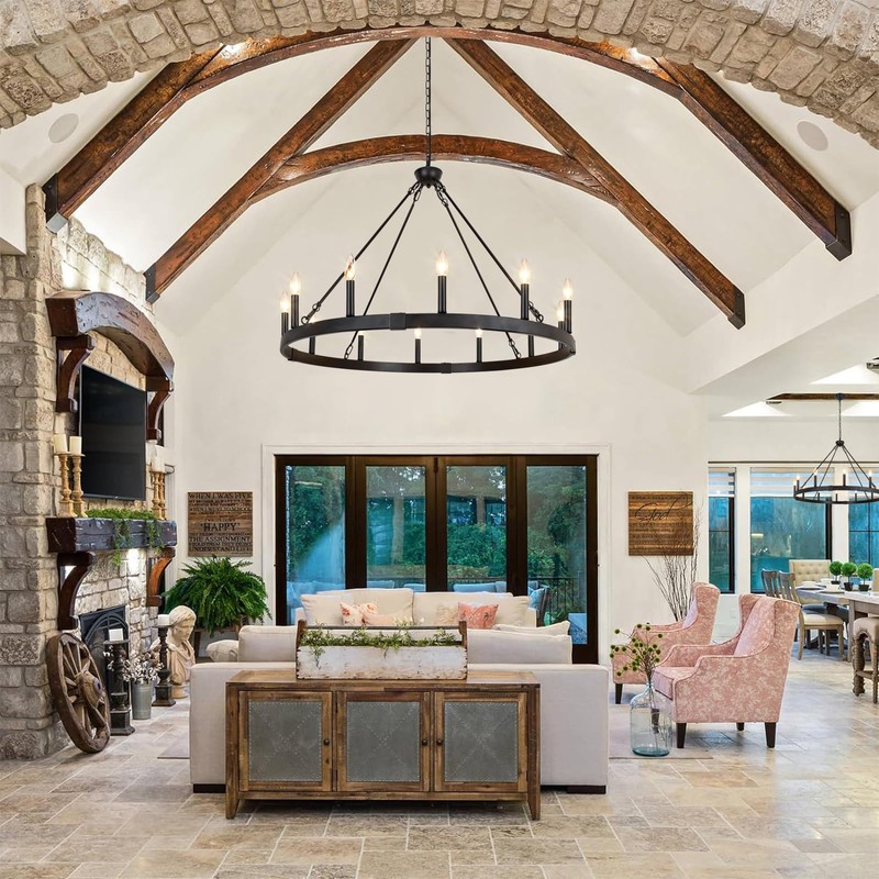 - ใ๐๐๐๐จ๐ฆ๐ฆ๐๐ง๐๐๐ ๐๐ฌ๐๐ฌใThis eye-catching chandelier is worth installing anywhere in your home. The bright lights are perfect for adding infinite beauty and appreciation to your house. Black round wagon chandelier is especially suitable for high ceilings, dining rooms, kitchen islands, living rooms, bedrooms, foyers, entryways, stairways, private villas, hotels, duplex building, exhibition hall etc. Also suitable for outdoor covered porches.