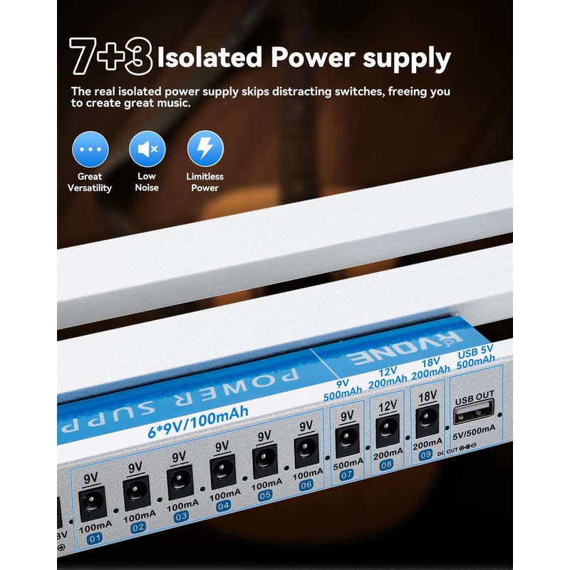 - This powered guitar pedal board features 10 independent power outputs. A single short - circuit won't affect the others.