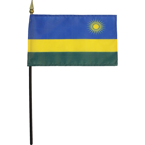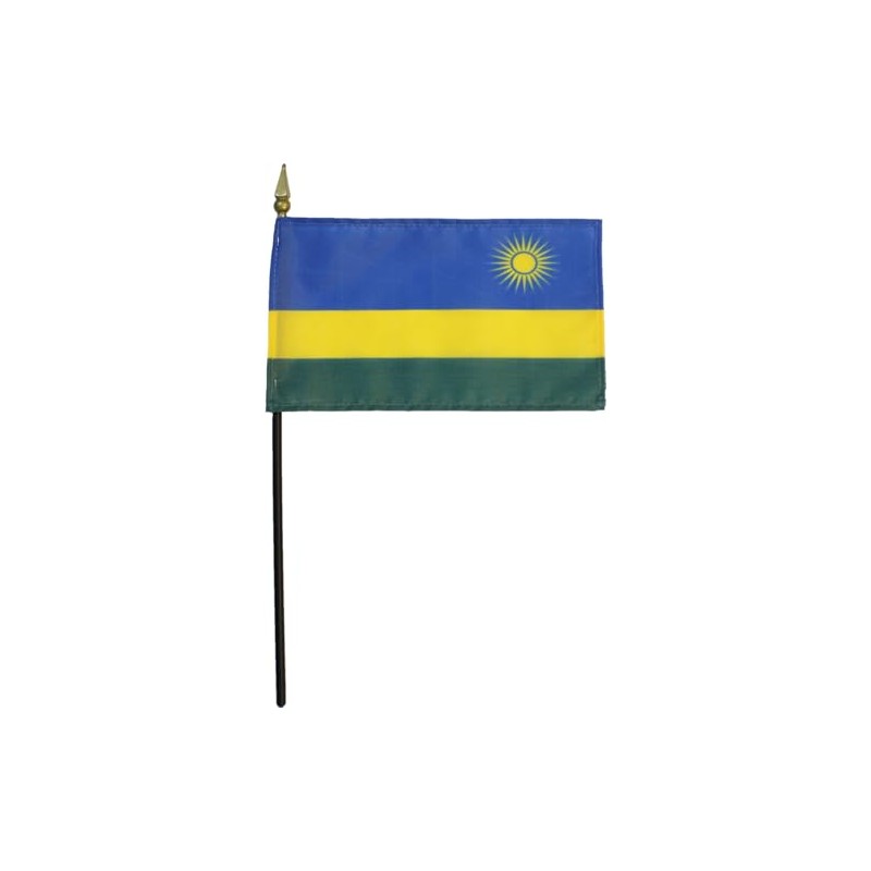 Our 4" x 6" Rwanda stick flags are made from a high quality, silk-like polyester fabric. They feature a hemmed flag mounted on a black plastic 10 inch staff with a gilded spear point. These versatile stick flags can be used on tabletops and desks, to wave in parades, or to decorate flower arrangements.