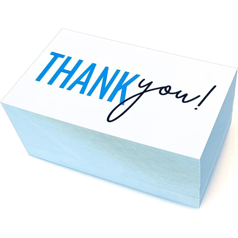 • Scripted Message: With 'thank' stylishly scripted in blue and 'you' in bold black, these cards deliver your message of gratitude with a , clean aesthetic.