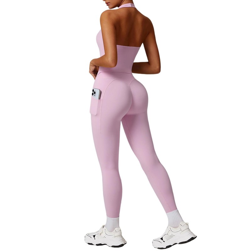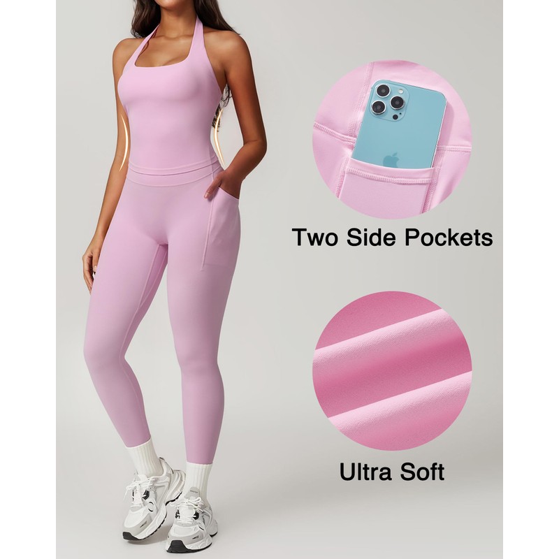 RXRXCOCO Open Back Workout Sets for Women 2 Piece Halter Tank Tops Hidden Scrunch Leggings Matching Set with Pockets Light Pink Medium