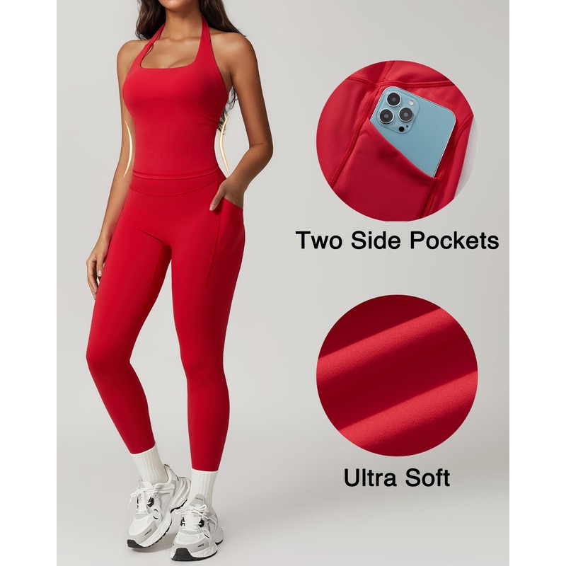 RXRXCOCO Open Back Workout Sets for Women 2 Piece Halter Tank Tops Hidden Scrunch Leggings Matching Set with Pockets Red Large