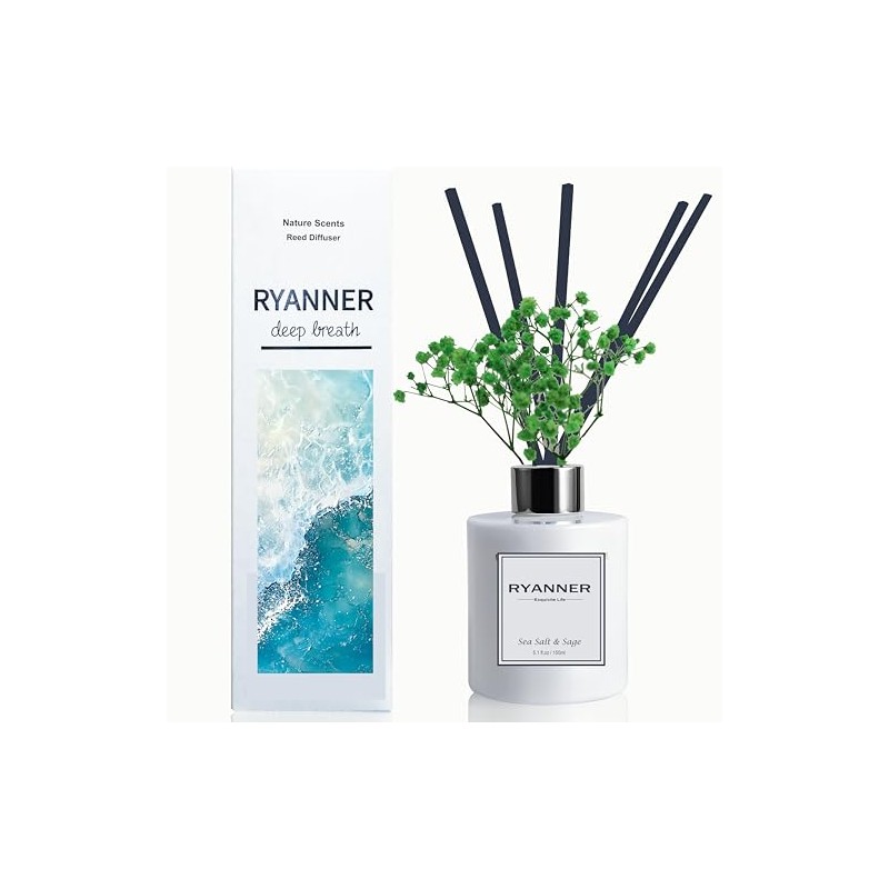 RYANNER White Bottle Reed Diffuser Set (Sea Salt&Sage)