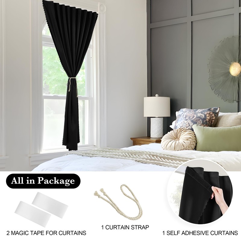 - Package Includes: 1 premium blackout curtain panel (35"W x 54"L) + 1 curtain strap + adhesive strip. Perfect for bedroom, rv and rental property.
