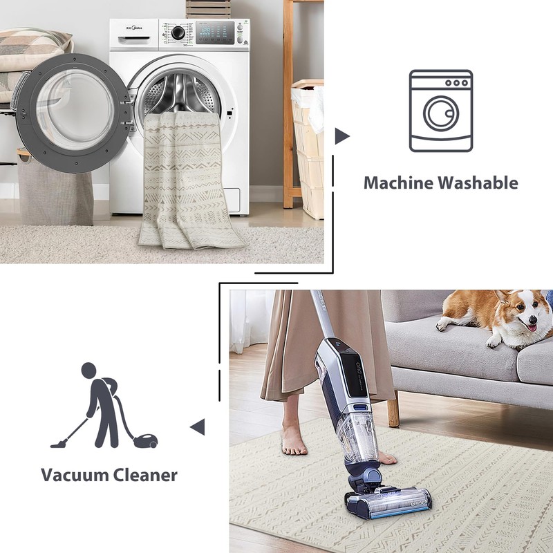 - Easy to Clean: Regular maintenance is simple with a broom or vacuum cleaner. For deeper cleaning, the Jacquard rug can be machine washed in cold water on a gentle cycle and should be air-dried afterward.