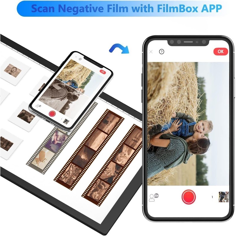 - 【Convert Slides and Negatives to Digital Images】It provides a perfect backlight for old slides and negatives. It can be used with the SlideScan app (for scanning photo slides) or FilmBox app (for scanning negatives) in your phone to scan slides and negatives and convert them to digital images.