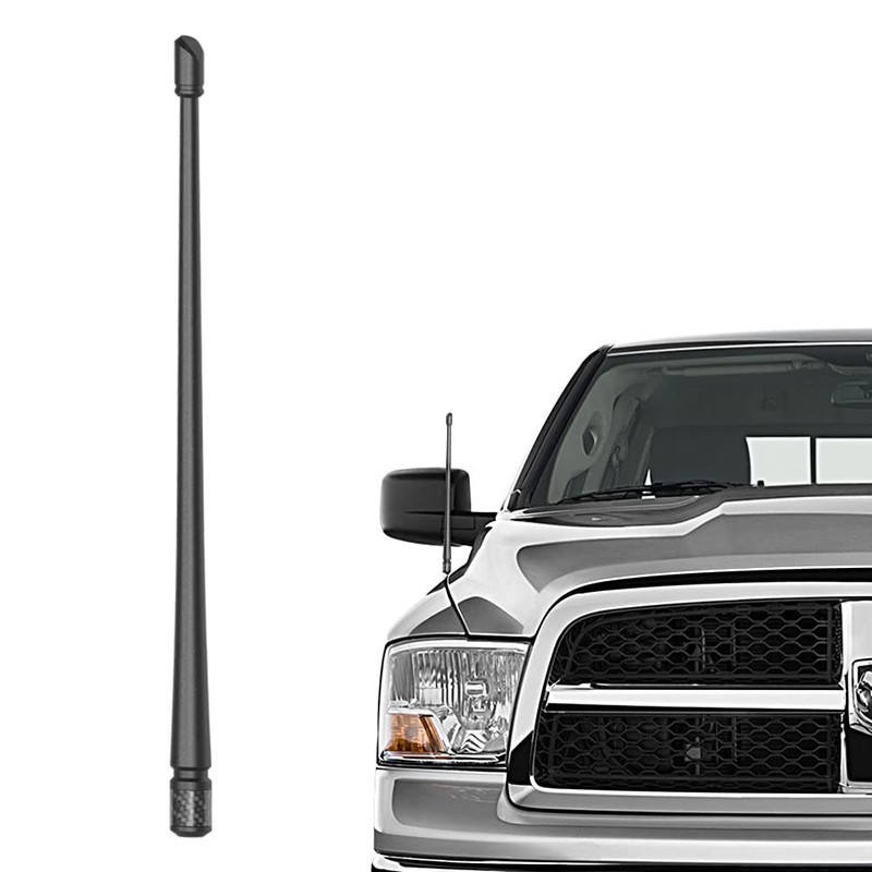 - STYLISH LOOKING:The Low Profile 13” antenna can Improve the look of your Dodge Ram truck by replacing your 31” long metal antenna. The real carbon fiber column on the bottom offers great looking and also helps the base holding onto the mount. Besides, the antenna is short enough that you have no need to worry about the antenna scrapping your garage door any more!