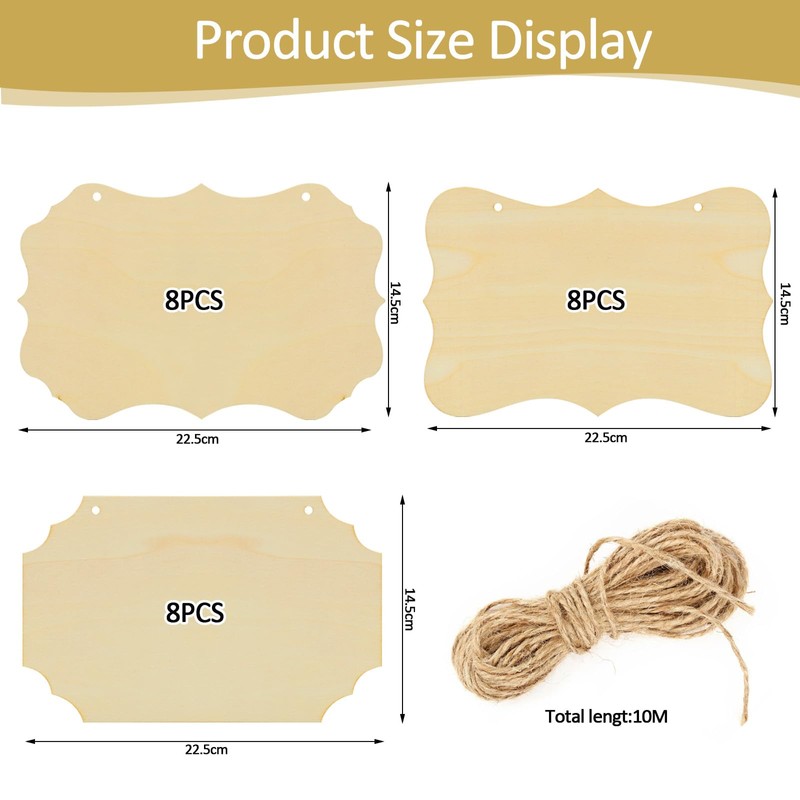 - Style Quantity: There are 3 styles of blank wooden signs, each with 8 pcs, for a total of 24. It also comes with a 10 meter long ropes.