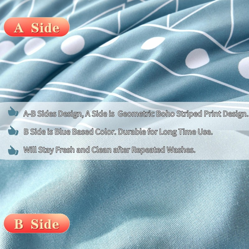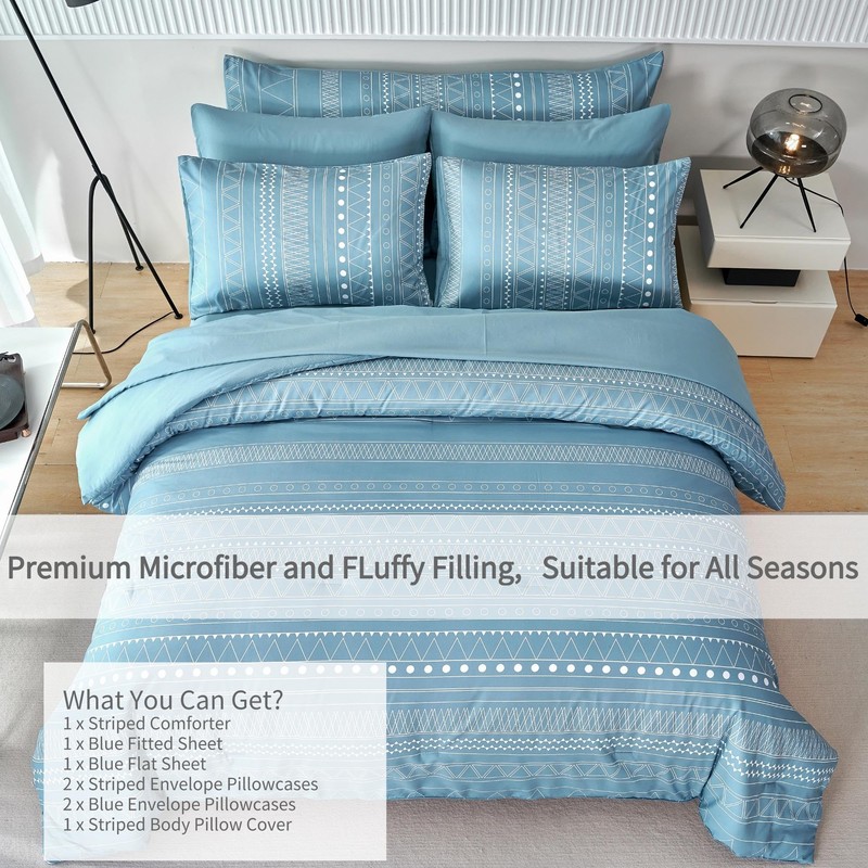 - 【Size & Measurement】Queen Size Smoky Blue Boho Stripe Comforter Collections Totally 8 Pieces: 1 Comforter: 90" x 90", 1 Fitted Sheet: 60" x 80" + 16", 1 Flat Sheet: 90" x 102", 2 Striped Envelope Pillowcases: 20" x 30", 2 Solid Envelope Pillowcases: 20" x 30", 1 Body Pillow Cover 20" x 54"