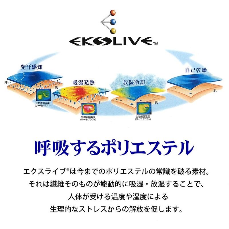 Toyo Boo fabric "Exlive" is a material that breaks the common sense of polyester. It circulates a series of functions, such as perspiration sensing, moisture dissipation, cooling and self-drying, so it is excellent in absorbing water and drying time. It also has an anti-microbial effect to reduce bad odors that occur with bacteria. In addition, it has the same pH control function as the fiber retains the same weak acid area as healthy skin, and the ability to decrease static electricity. In addition to the "Exclusive" processing the material is multifunctional and highly functional with UV protection.
