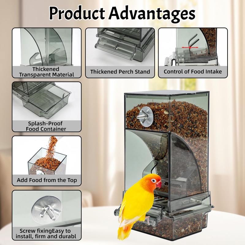 - Easy installation: Our parrot feeder cage accessories are easy to install with a full range of accessories; Just use the matching screws to fix it on the cage; The automatic bird feeder can then be fixed outside or inside the cage, no need to take it out; You can open the top cover directly to add food without removing it