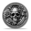 This Memonto Mori Memonto Vivere coin features a prominent skull on the front, encircled by blooming roses and an hourglass at the center, symbolizing the transient nature of life and the beauty that surrounds it.