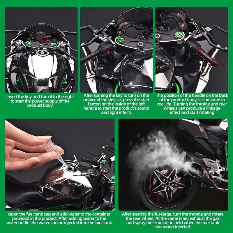 - 【Multi Function Kawasaki H2R Motercycle】The H2R toy front and rear lights and instrument panel can be illuminated after inserting the key to start.The ignition button on the left handle starts the motorcycle sound. After starting, twisting the throttle on the right handle will produce a linkage effect with the rear wheel, simulating real motorcycle rotation. Open the fuel tank cap and fill the fuel tank with water from a water bottle, and the exhaust pipe mouth will produce a spray effect.