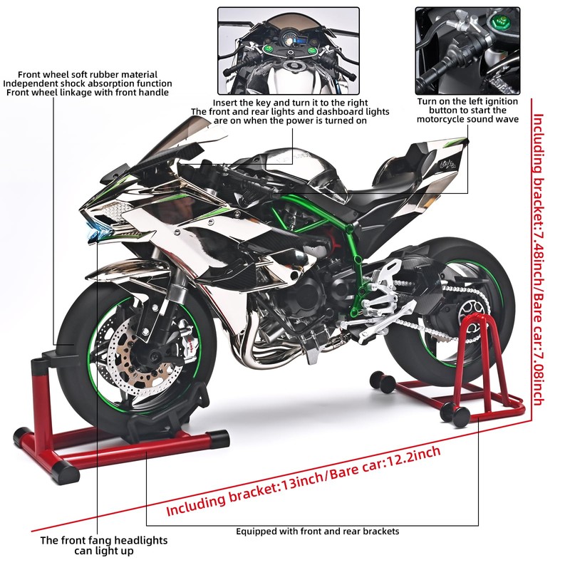 - 【Kawasaki Motorcycle Features】The front wheel of the Kawasaki metal motorcycle can be turned left or right with the handle.Front and rear wheels simulates the shock absorber effect.The tripods simulate a real motorcycle can be retracted.Equipped with front and rear display stands that can be freely disassembled to match the display scene.Not only suitable for your own collection, but also a special gift for your family and friends. It can be used to decorate men's offices and boys' rooms.