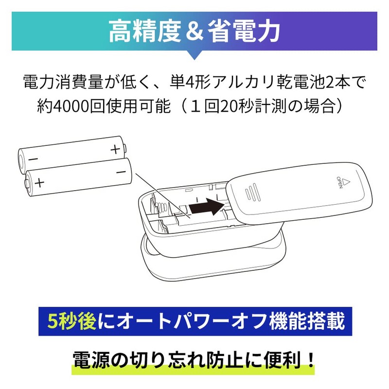 - 【高精度で省電力】電力消費量が低く、単4形アルカリ乾電池2本で約4000回使用可能(1回20秒計測の場合)