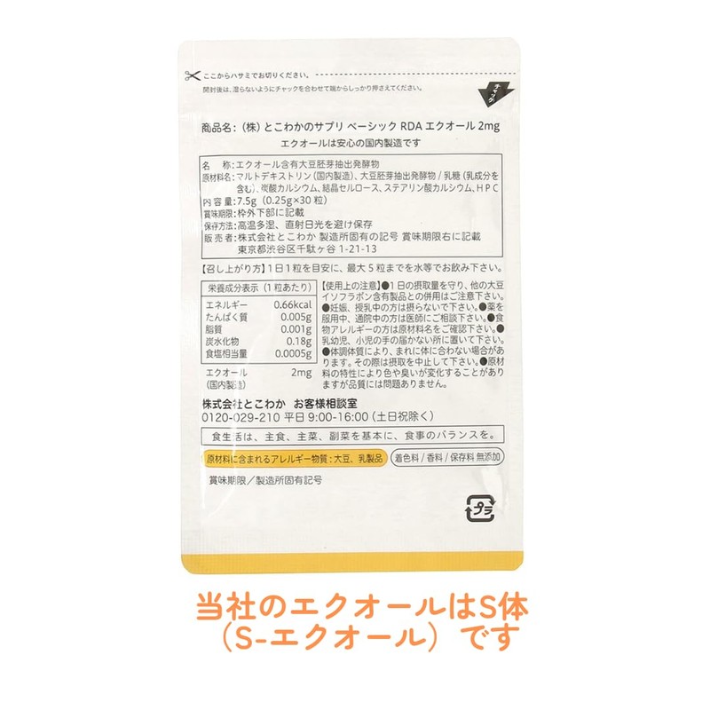 【エクオール】を直接摂取 発酵大豆イソフラボン 【国内製造 S-エクオール】 約30日分 <エクオール2mg/1粒> 30粒入 飲み始めの方へ ゆらぎ 更年期 【とこわかサプリベーシックRDA2】