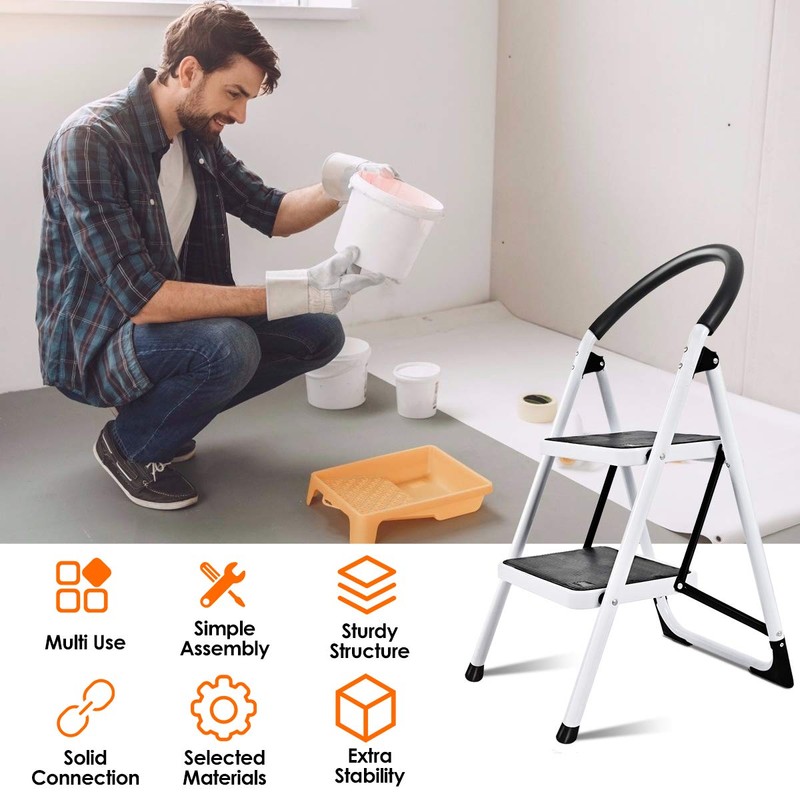 • đŸȘœă€Suitable for Various Occasion】 This foldable 2 steps ladder is an ideal tool for many tasks in various places. It will be a good assistant to help you change the light bulb, reach a high cabinet or wash the windows. Besides, it is also perfect for gardens or yards to prune trees and pick fruit.