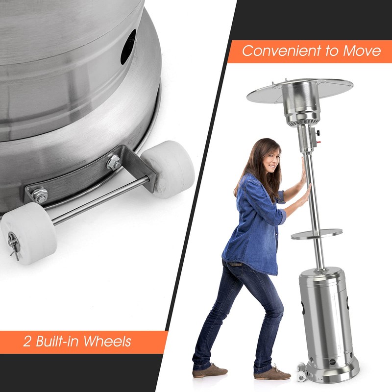 - 【Hassle-Free Use & ❤Extra Built-in Storage Space❤】The patio heater comes with two smooth-rolling wheels, making it easy to move the outdoor heater without any load. What’s more, the floorstanding heater features a built-in space for hiding the fuel tank, which also features extra shelf to place some drinks and wines, so you can enjoy the leisure time with your friends.