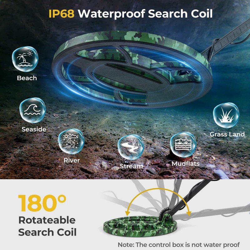 - IP68 Waterproof Search Coil: Featuring a premium 26cm/10" IP68 waterproof search coil, our metal detectors can be used in various outdoor environments such as seasides, beaches, rivers, streams, mudflats, and grasslands. Moreover, the lightweight design adds to the convenience for outdoor use. Please note that the control box is not waterproof.