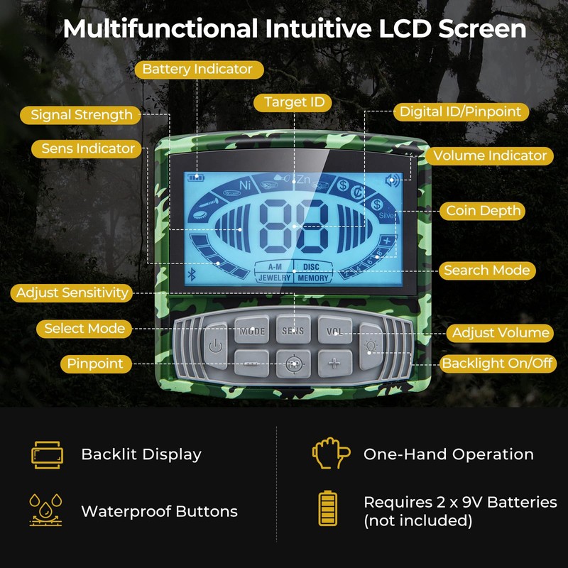 - Multi-situation Adaptable Detector: The multifunctional intuitive LCD screen features a backlit display that allows for easy visibility for adjustment whether it's day or night. Additionally, the waterproof buttons ensure seamless operation in drizzle, enabling you to enjoy the thrill of exploration on rainy days. Please note that the detector requires 2 x 9V batteries (not included).