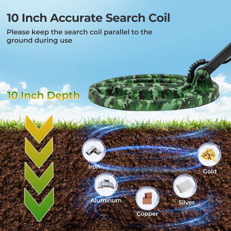 - Accurate & Efficient Metal Detector: Utilizing a 26cm/10" accurate search coil, this metal detectors allows you to easily locate buried treasures up to 26cm/10" in depth. Please keep the search coil parallel to the ground during use.