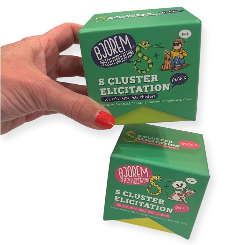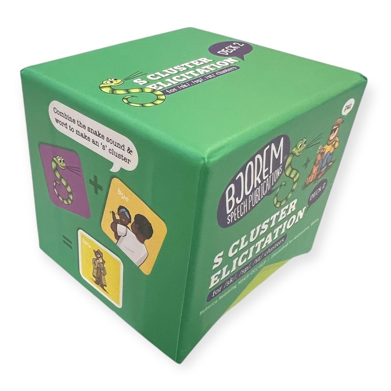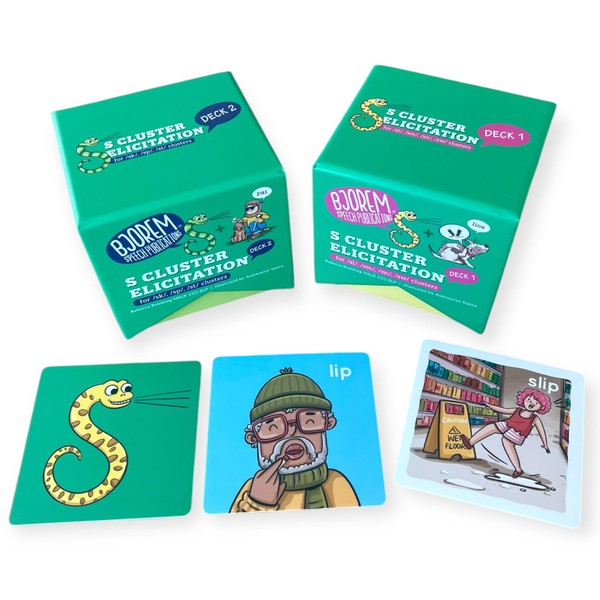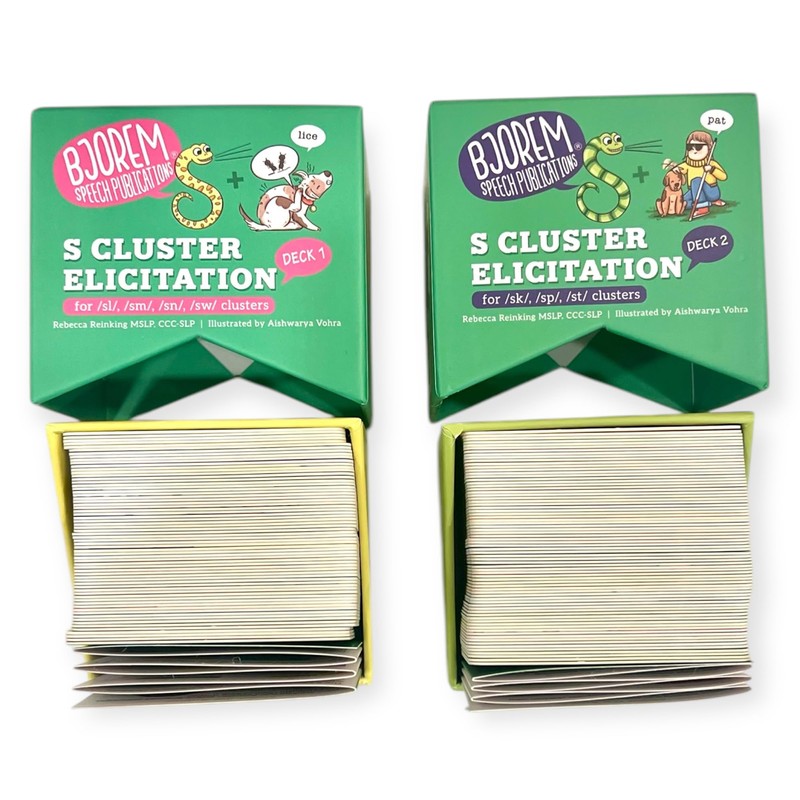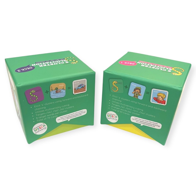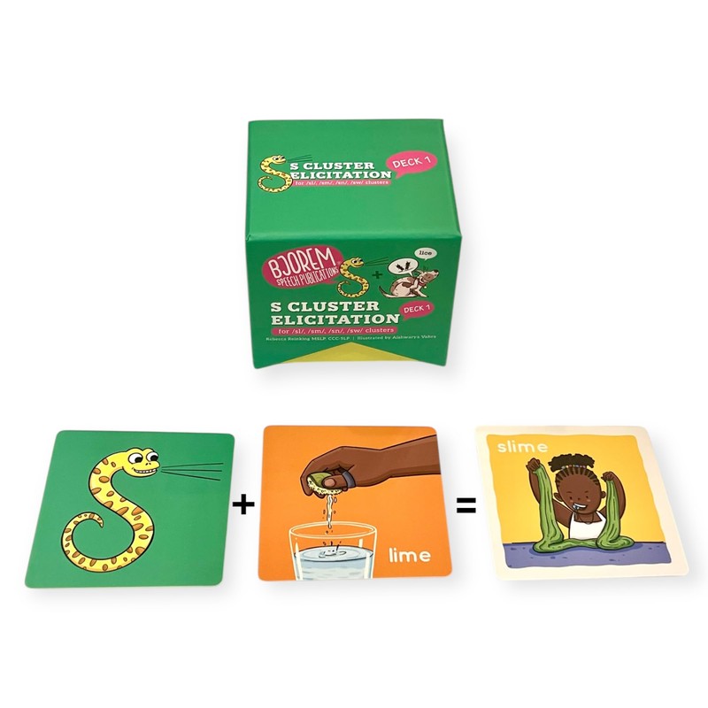Rebecca Reinking's S Cluster Elicitation Bundle Unlock the secret to mastering tricky /s/ clusters with Rebecca Reinking's S Cluster Elicitation Bundle! This innovative bundle features two comprehensive decks, meticulously designed to support children who find /s/ clusters challenging to pronounce. Packed with strategies that work, this bundle ensures engaging and effective therapy sessions. Why Choose the S Cluster Elicitation Bundle? Smart Visual Cues: The decks incorporate a snake visual cue card to remind children to start their /s/ sound, making therapy fun and visually engaging. Customizable Techniques: Using forward and/or backward chaining, these cards allow Speech-Language Pathologists (SLPs) to break difficult clusters into manageable chunks, building confidence and accuracy in articulation. Inclusive and Fun: Each card integrates dynamic, child-friendly illustrations to keep kids motivated and engaged. What’s Inside? Deck 1: Includes 65 cards targeting /sl/, /sm/, /sn/, and /sw/ clusters. Deck 2: Features 73 cards focused on /sk/, /sp/, and /st/ clusters. We have included voiced and voiceless cognates to help with motor planning, childhood apraxia of speech and coarticulation. A total of 138 cards ensures a robust toolkit for tackling /s/ cluster challenges. How It Works: The snake imagery helps children associate the visual cue with starting the /s/ sound. By "tricking" their brain or mouth, kids learn to seamlessly produce their /s/ clusters without omitting sounds. Once mastered, these skills can transition to independent usage, making everyday communication smoother. This bundle is ideal for SLPs, educators, and parents seeking research-based, practical solutions for speech therapy. Bring the fun and functionality of Rebecca Reinking's S Cluster Elicitation Bundle into your therapy toolkit today!