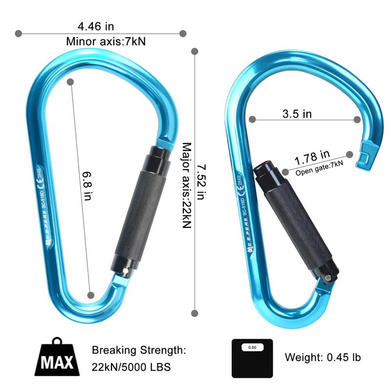 - Strong & Lightweight: Length :7.52 "; Width :4.46 "; Open gate :1.78 "; Net weight: 0.45 lb. Major axis: 22kN (5000 lbs), Minor axis: 8kN, Open gate: 7kN. Made of 7075 aviation grade aluminum, strong and durable, but very light weight, and rust resistant. Easy to carry, your long-term use of the best choice.