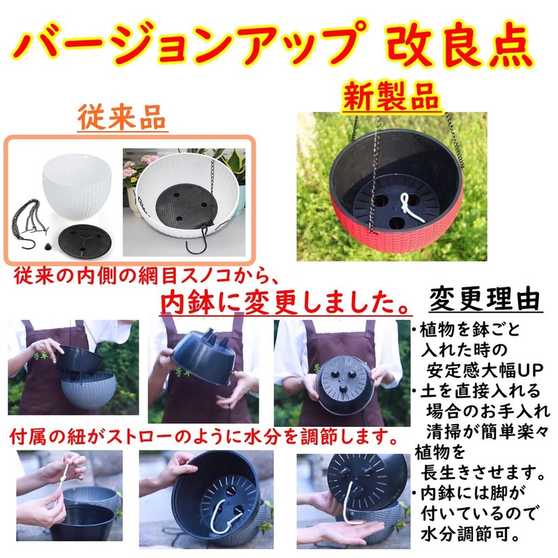 - Introducing a new version of the popular hanging pot planter with an even better improvement. The conventional product was just inserted with a mesh slab inside, but the new version has been improved to an inner pot with legs that serve as a snowboard