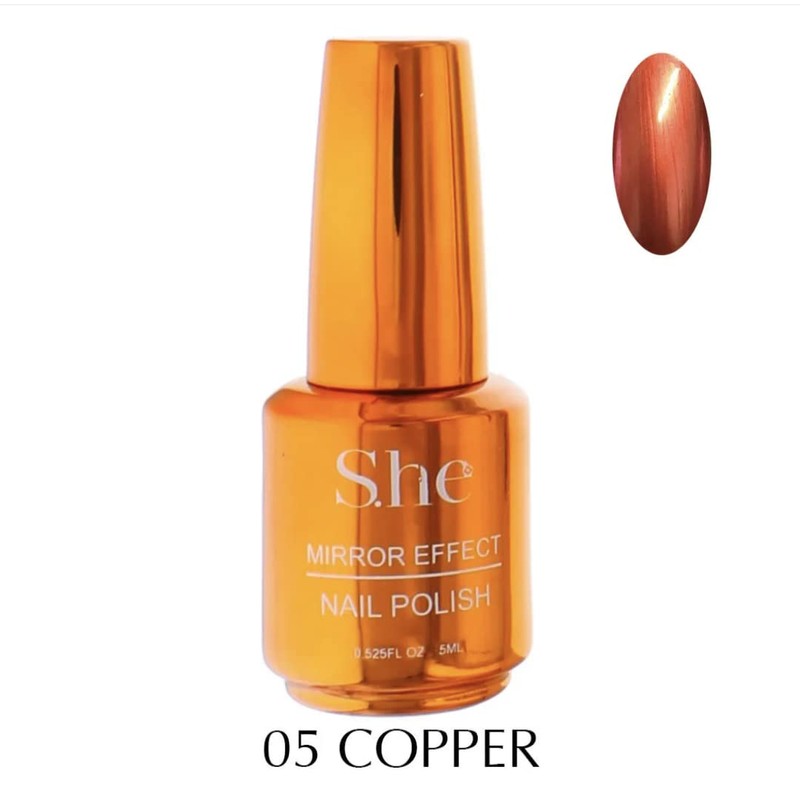 Fast Drying Mirror Effect Nail Polish by She Makeup is available in various colors. Standard nail polish, no light needed. 0.52 fl.oz / 15ml