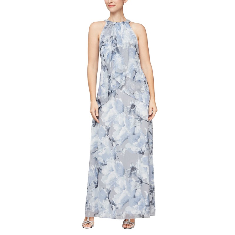 S.L. Fashions Women's Long Maxi Chiffon Gown with Jewel Halter Neck Dress, Blue Grey Floral, 16
