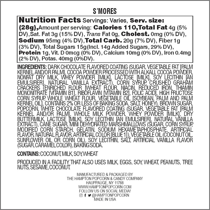 - Our gourmet S'mores Popcorn features caramel corn covered in rich dark chocolate and mixed with crisp graham crackers and marshmallows.