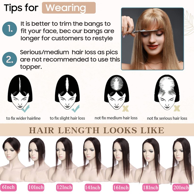 - 【Neat Bangs】: Longer length can trim it to fit your face better or restyled. We recommend to restyle it with flat iron to make a air fringe or french fringe.:Topper with bangs make it looks more realistic and energetic.Finds your youth, and makes your self-esteem up.