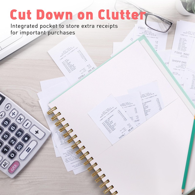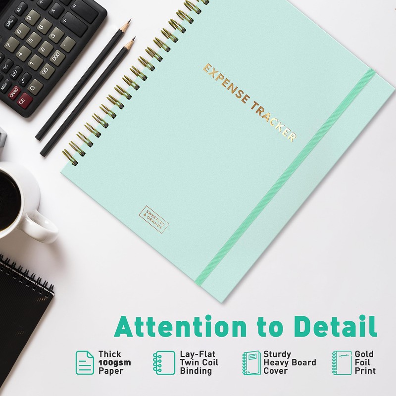 - Professional Appeal, Practical Design –– Pick up a polished business expense tracker notebook that features an elegant mint-colored cover with gold foil print. The lay-flat spiral coil allows for effortless opening to reveal a cleverly placed pocket to stash your receipts and bills