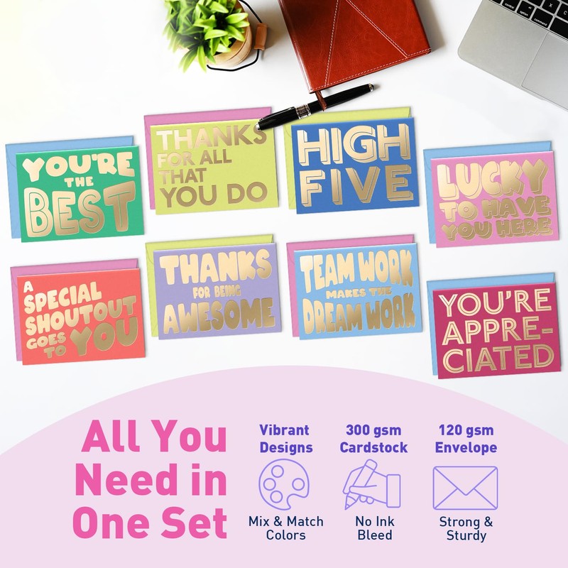 - Versatility for Every Occasion — Choose from 8 unique thank you cards, each designed with classy gold foil to express your gratitude. Use them as work anniversary cards for employees or just because you appreciate your colleague. Suitable for personal or professional use, this abundant stationary set makes sure you always have the right card for any moment of thanks