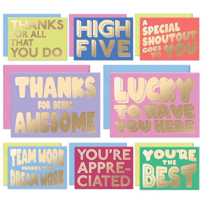 - Tokens of Gratitude — Having a thank you card pack of 24 at your desk is like having a toolbox for connection. Grab an appreciation card whenever your coworker jumps in to save the day or even when someone from IT fixes your computer. These small employee appreciation gifts help make you the kind of teammate or leader everyone wants to work with