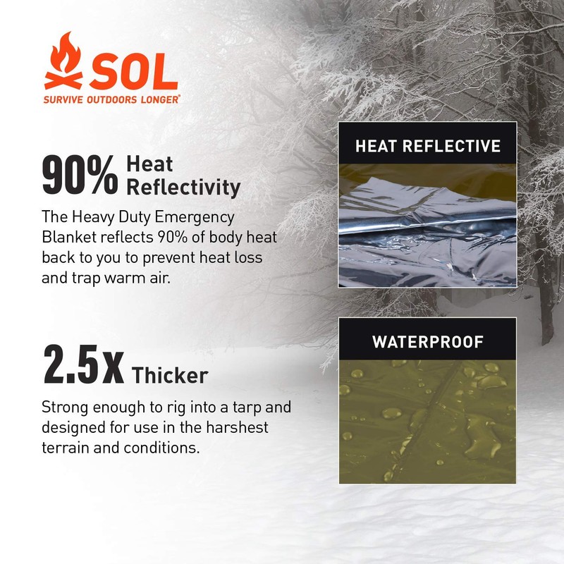 The S.O.L. Survive Outdoors Longer Heavy Duty All Purpose Emergency Blanket is an ultra-versatile, all-purpose emergency shelter designed for use in the harshest terrain and conditions. Weighing in at only 7.9 ounces, this 5 x 8 foot shelter packs down to a pocket sized package, yet can withstand almost any abuse you can throw at it. Wind & waterproof and 90% heat reflective, the S.O.L. Heavy Duty Emergency All Purpose Blanket will keep you warm and dry and is tough enough to survive multiple adventures. This can be used as an emergency blanket, survival shelter, ground tarp, gear cover, load hauler, or even a picnic blanket.