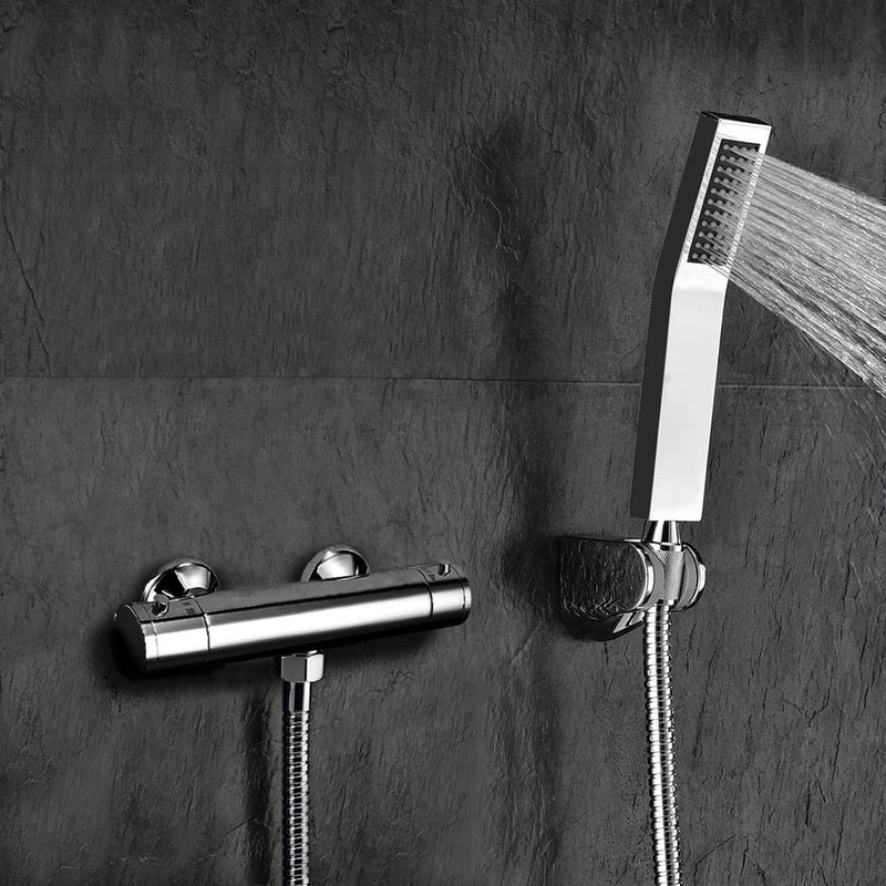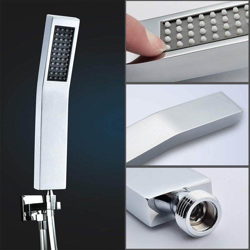 - Elegant design: The modern L contour design in shiny chrome complements itself perfectly in any bathroom, shower or guest toilet. Small, lightweight and easy to handle: The shower head can be plugged in and out of the shower bracket: many uses.