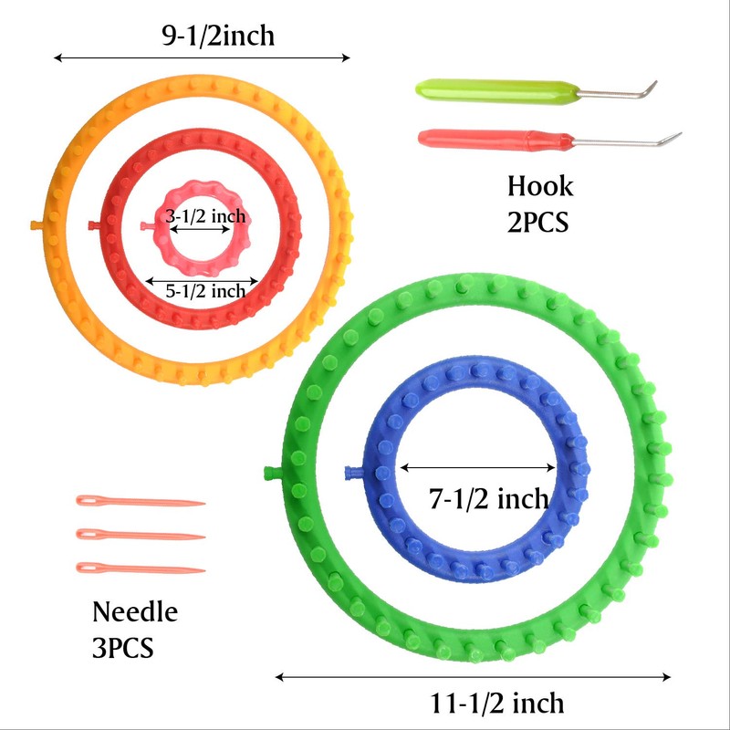- 1. Round knitting looms Set includes 5 sizes looms ( 3-1/2 inch loom; 5-1/2 inch loom; 7-1/2 inch loom; 9-1/2 inch loom; 11-1/2 inch loom), 2 pcs Yarn Needle, 2 pcs Crochet Hooks, 1 pcs Basic instructions.