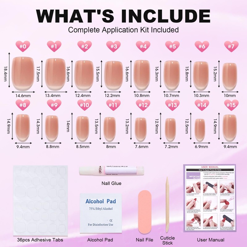 - Fake Nails Kit Include: 32 Nails in 16 Sizes,Various nail sizes ensure a totally custom fit your size. Reusable nail tips.Each set comes complete with nail glue, 36 Pcs adhesive tabs, double-sided nail file, cuticle stick, and prep pad.
