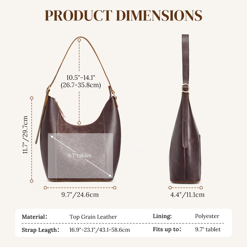 - Humanization Design: The shoulder strap of this leather handbag can be adjusted from 16.9“ to 23.1”. Rivets on the bottom, it can be placed on the table or floor without scratching the bottom. Exterior open pocket can fit 6.67" cell phone or keys, shopping tickets, etc., very easy to access