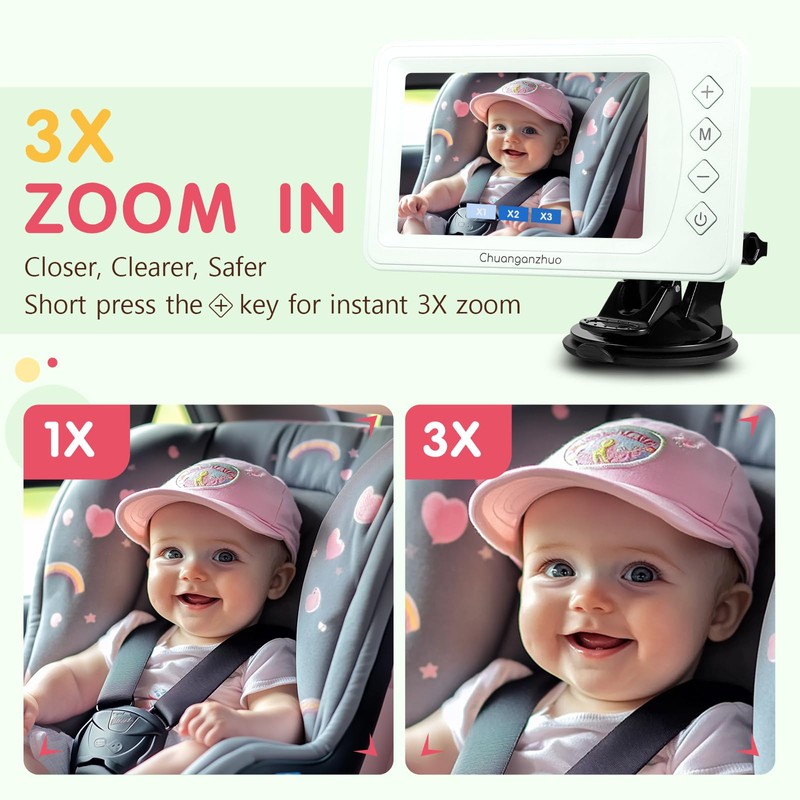 - 【3X Zoom with Front-Access Controls】This baby car camera features 3X zoom, allowing you to quickly check your baby's status with the intuitively placed (+) button. No more distracted driving from searching for side/rear controls - our front-access design lets you verify pacifiers or blankets without ever looking away from the road. The perfect companion for family trips and daily commutes