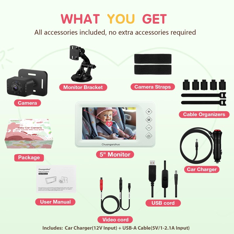 - 【All Installation Accessories Included】This USB baby car camera includes all accessories and excels with dual power options (USB powered and car charger powered )-a standout feature compared to others offering only car charger. The total 26ft cable ensures compatibility with most vehicle models, It also features cable organizers for tidy wire management. What you get: 1xBaby Car Camera, 1xBaby Car Monitor, 1xCamera Strap,1xVideo Cord, 1xUSB A Cord, 1xCar Charger, 1Set x Cable Organizes