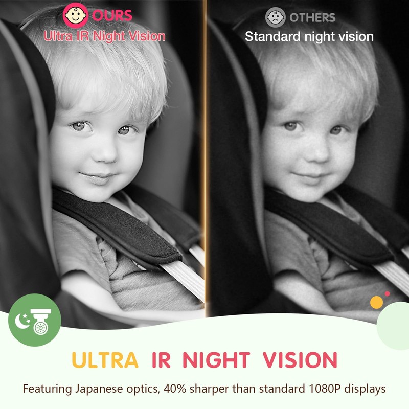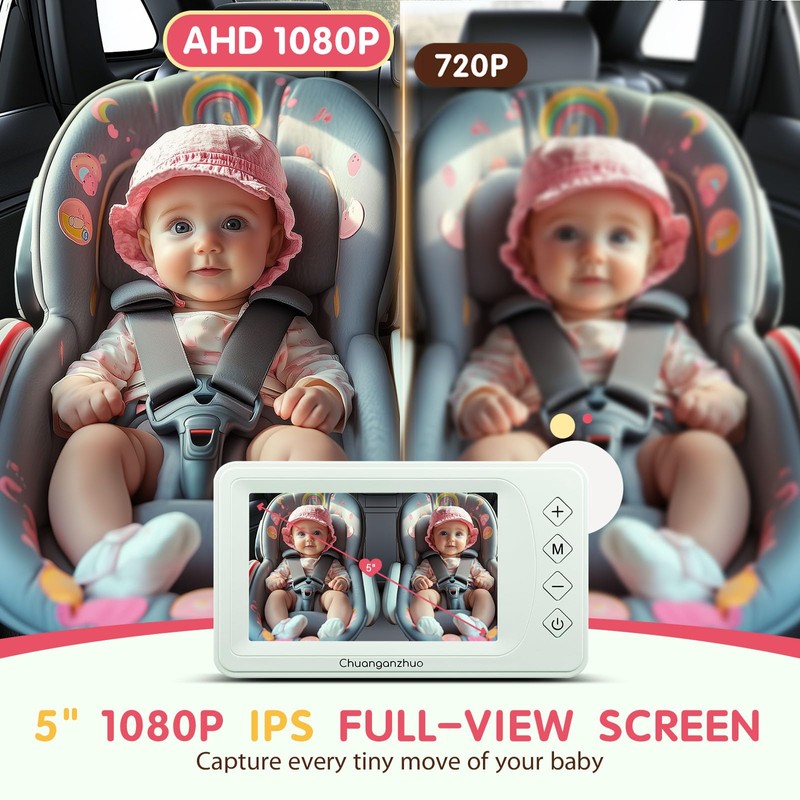 - 【5" 1080P IPS Pro-Monitor with Japan Optics】Now enhanced with Japanese-made lens and sensor technology, our baby car monitor achieves unprecedented clarity-40% sharper than standard 1080P displays. The advanced optics deliver softer yet more detailed images with true-to-life colors, capturing your little one's every movement. The premium IPS screen ensures consistent color reproduction from any viewing angle. At 5 inches, it's clearer than 4.3" and more compact than 7" for optimal visibility