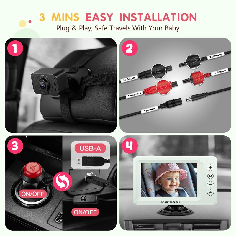 - 【3-Minute Effortless Installation】This car baby camera/monitor is designed for a hassle-free setup. With labeled installation guides and dual power options(USB or car charger), new parents can complete the installation in just 3 minutes. The customized HD video cable features pure copper wire and double-shielded treatment, ensuring a stable connection, reduced wiring time, and crystal-clear video transmission free from interference lag
