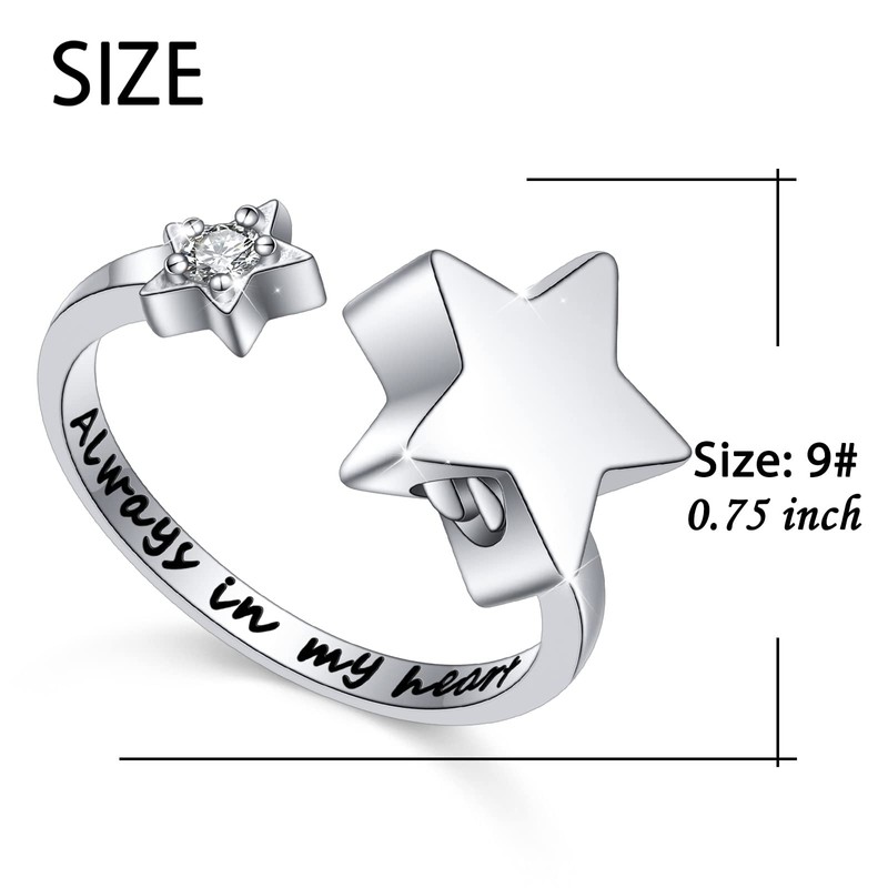 S925 Sterling Silver Always In My Heart Cremation Urn Ring Star Memorial Ashes Keepsakes Open Finger Ring Jewelry for Women,Size 8