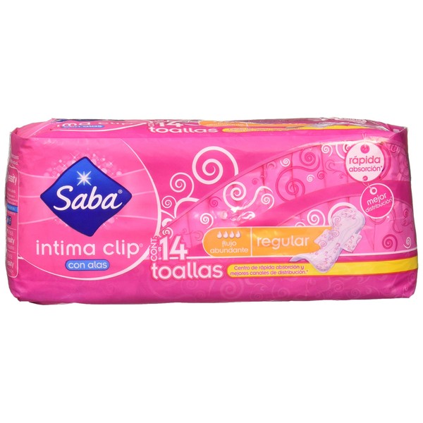 Saba Toallas Sanitarias para Dama Intima Clip con Alas Regular, color Rosa, 14 Piezas