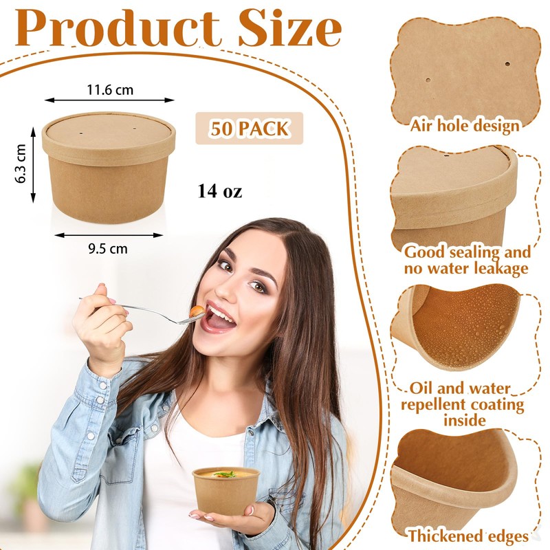 - Vented Lids: the paper soup bowls are featured with vented lids design, can release hot air to prevent the containers from soaking wet, while still maintaining the temperature, and it can prevent dampness from accumulating inside; The top seal is firm, which helps to keep food fresh for a long time